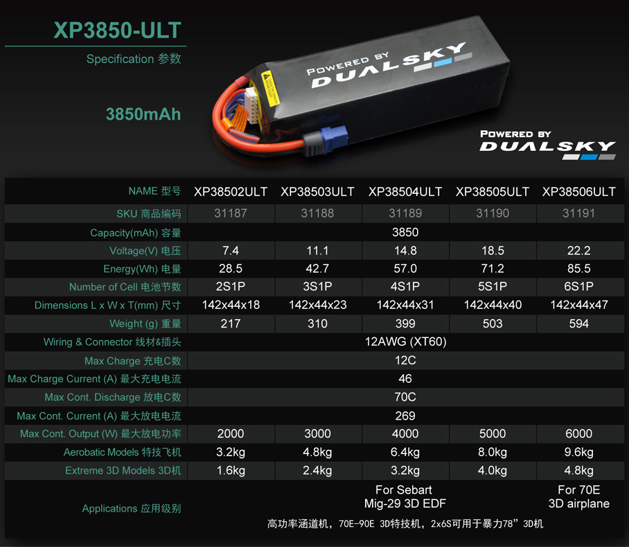 | 31191 | XP38506ULT, 70E 3D Airplane | 3850 mAh | 22.2V | 70C |