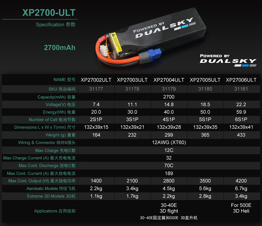 | 31180 | XP27005ULT | 2700 mAh | 18.5V | 70C |