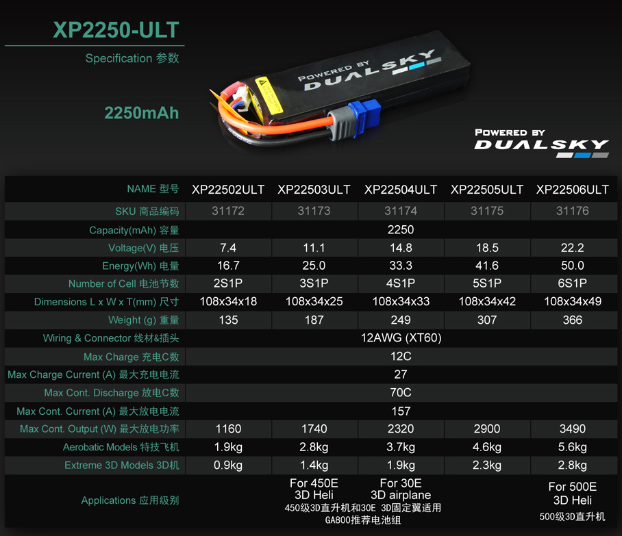 | 31176 | XP22506ULT, 500E 3D Heli | 2250 mAh | 22.2V | 70C |