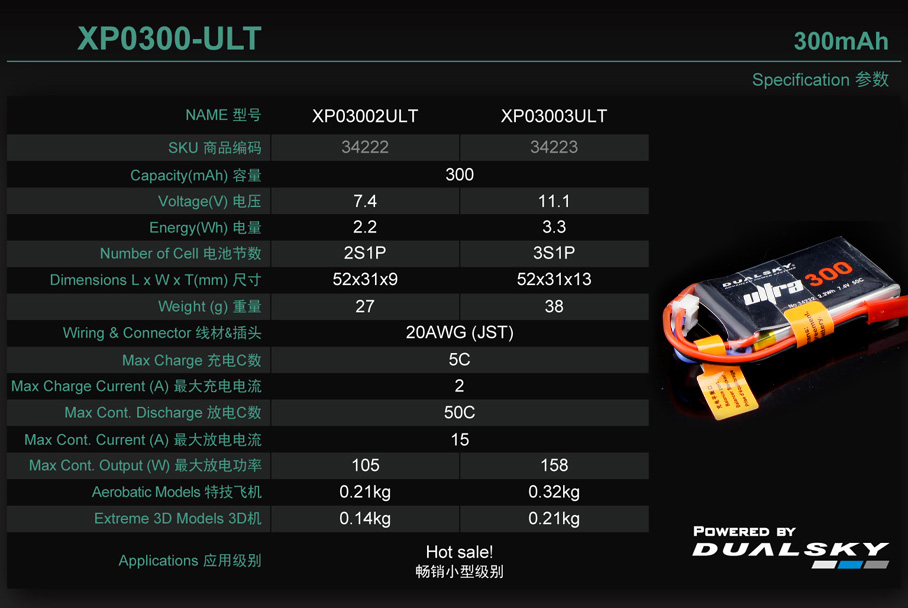| 34222 | XP03002ULT | 300 mAh | 7.4V | 50C |