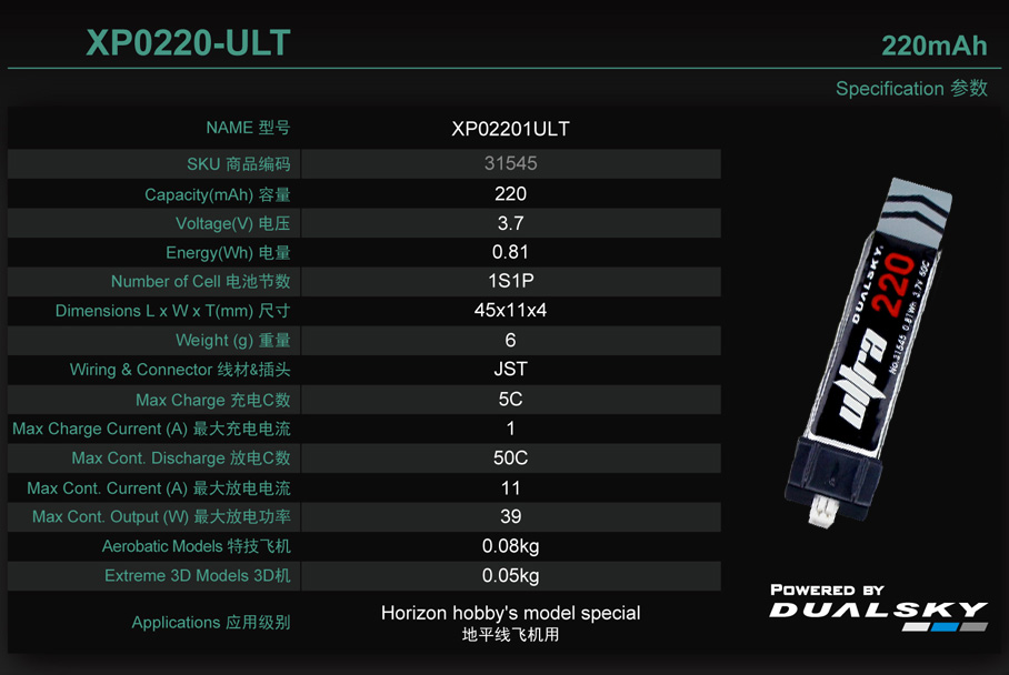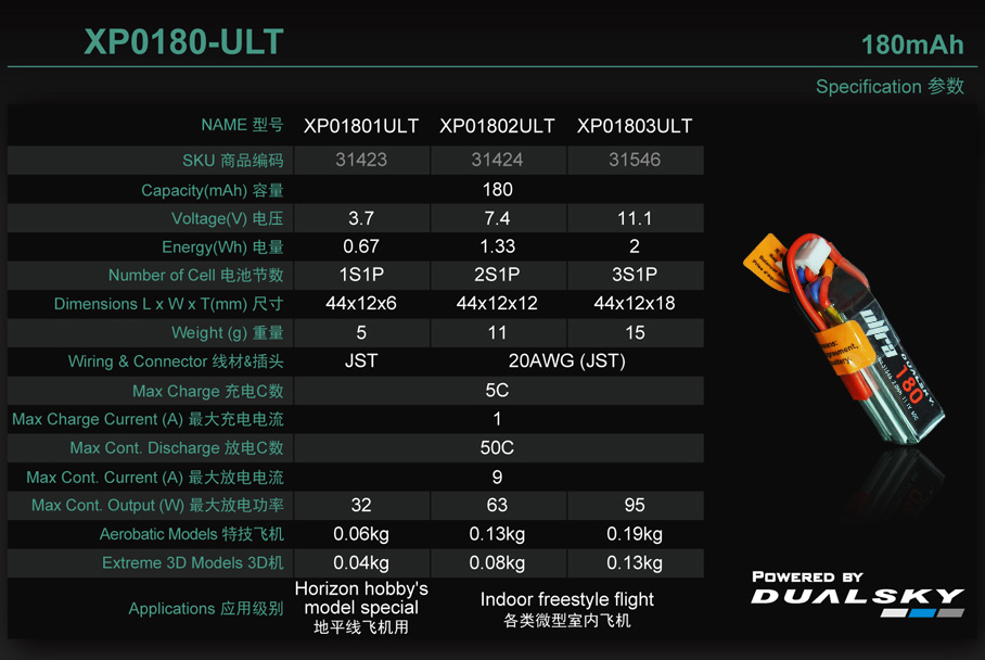 | 31423 | XP01801ULT | 180 mAh | 3.7V | 50C |