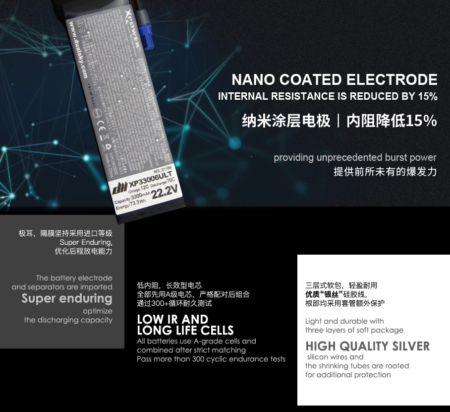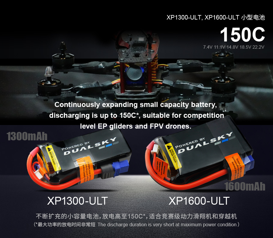 * Continuously expanding small capacity battery, discharging is up to 150C*, suitable for competition level EP gliders and FPV drones.
