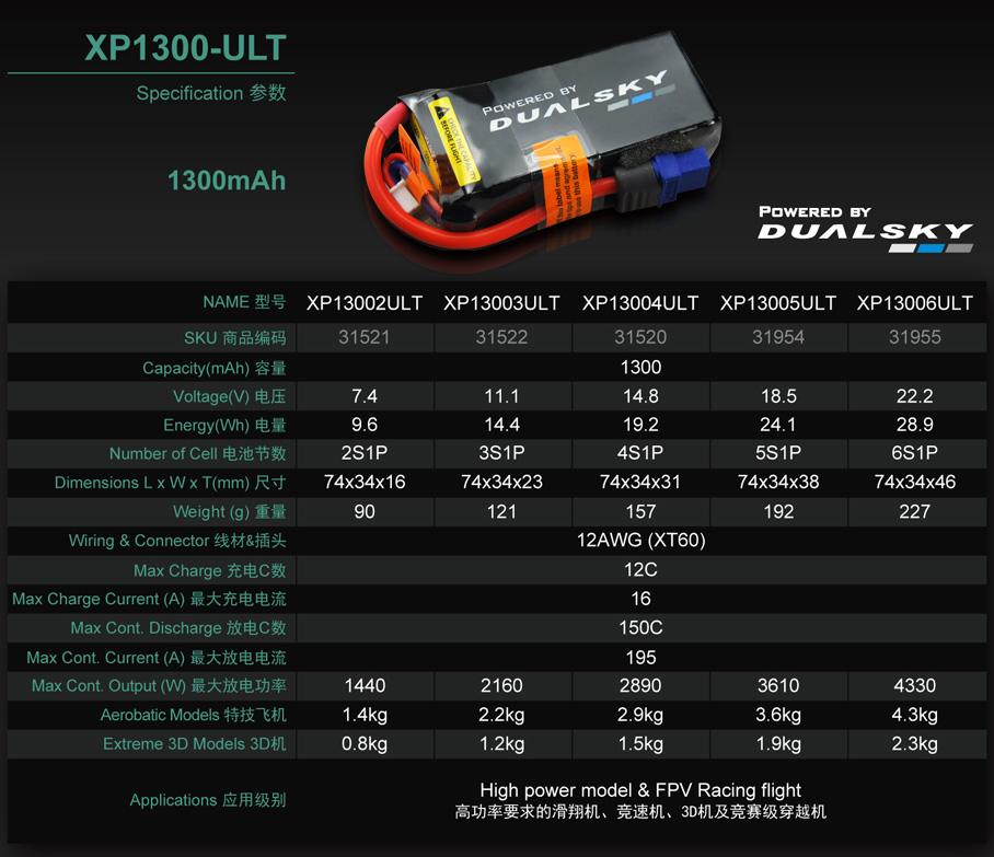 | 31954 | XP13005ULT, NEW | 1300mAh | 18.5V | 150C |