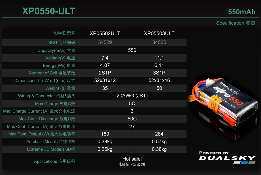 | 34530 | XP05503ULT | 550 mAh | 11.1V | 50C |