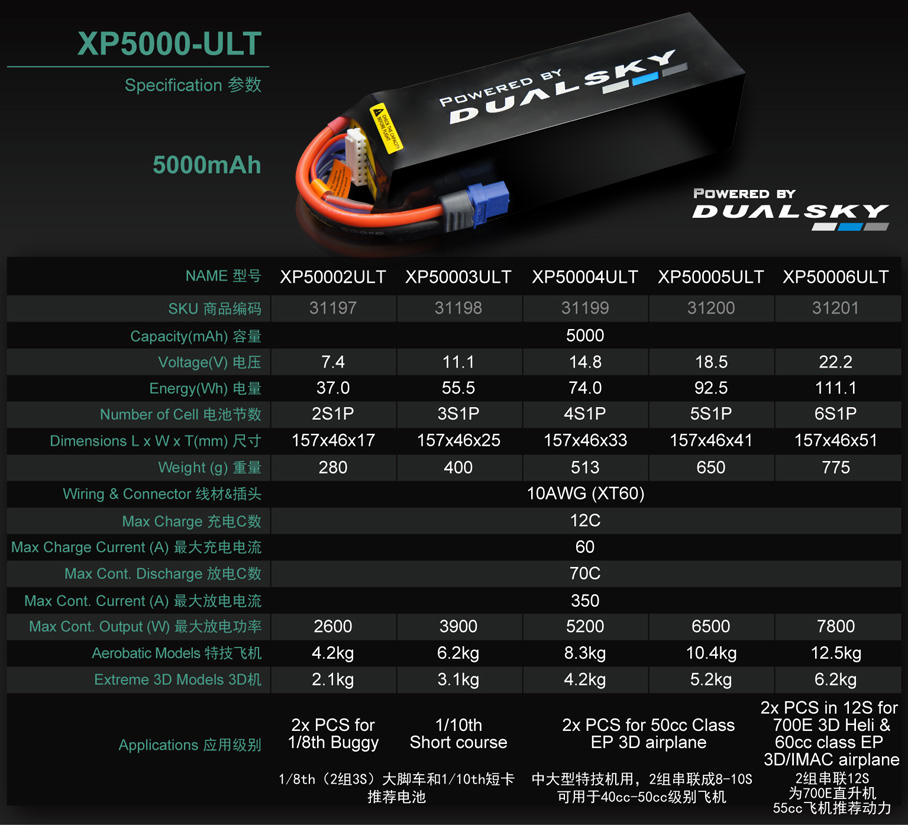 | 31200 | XP50005ULT, 4000W 3D Airplane | 5000 mAh | 18.5V | 70C |