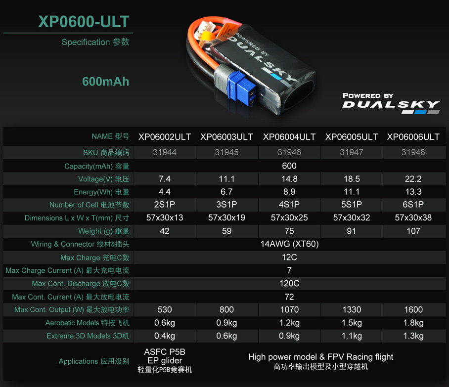 | 31947 | XP06005ULT, NEW | 600mAh | 18.5V | 120C |