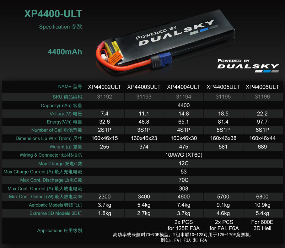 | 31196 | XP44006ULT, for 600E 3D Heli | 4400 mAh | 22.2V | 70C |